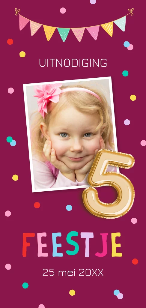 Uitnodiging kinderfeestje langwerpig voor een meisje 5 jaar met foto, confetti en slinger.
