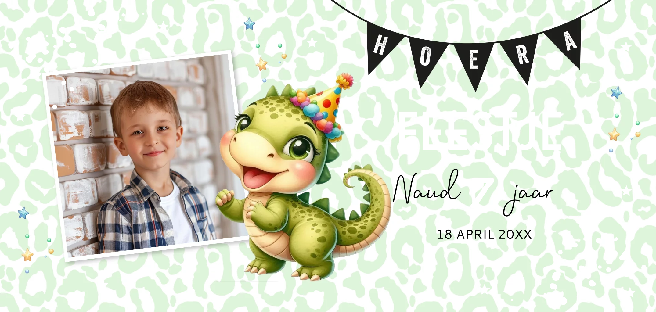 Uitnodiging kinderfeestje voor een jongen met foto, dino, slinger, panterprint groen en goudfolie.