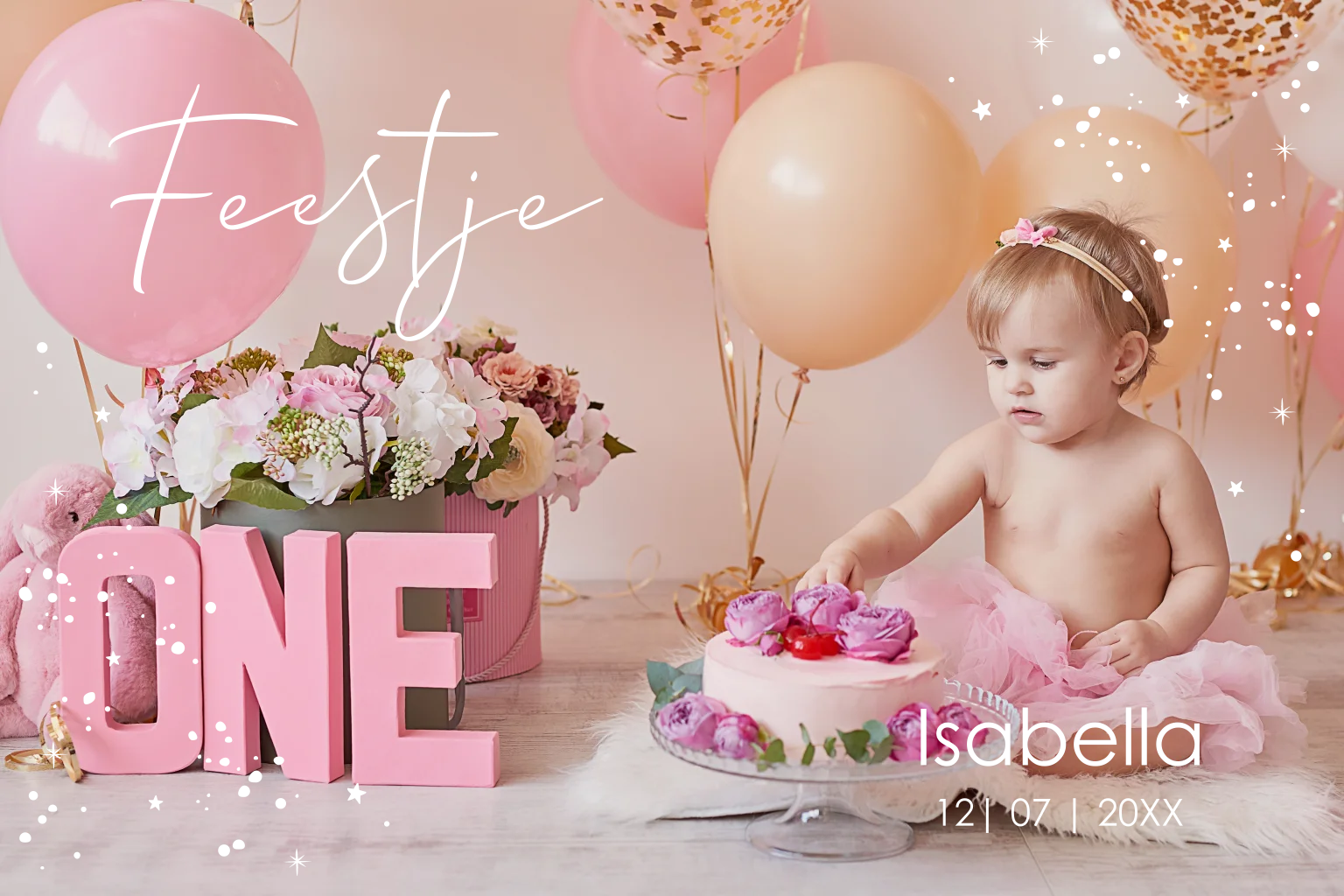 Uitnodiging kinderfeestje meisje 1 jaar eigen foto goudfolie