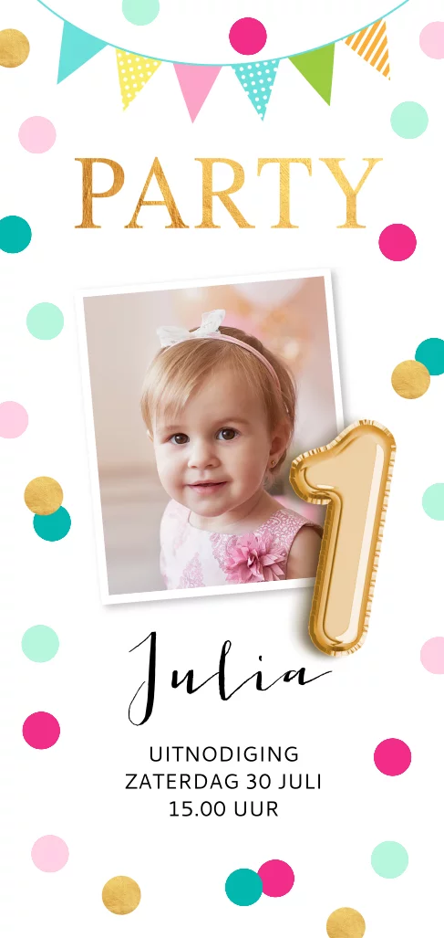 Uitnodiging kinderfeestje langwerpig wit voor een meisje 1 jaar ballon met eigen foto en feestelijke roze gekleurde confetti dots, slinger en goudlook. Geen folie!
