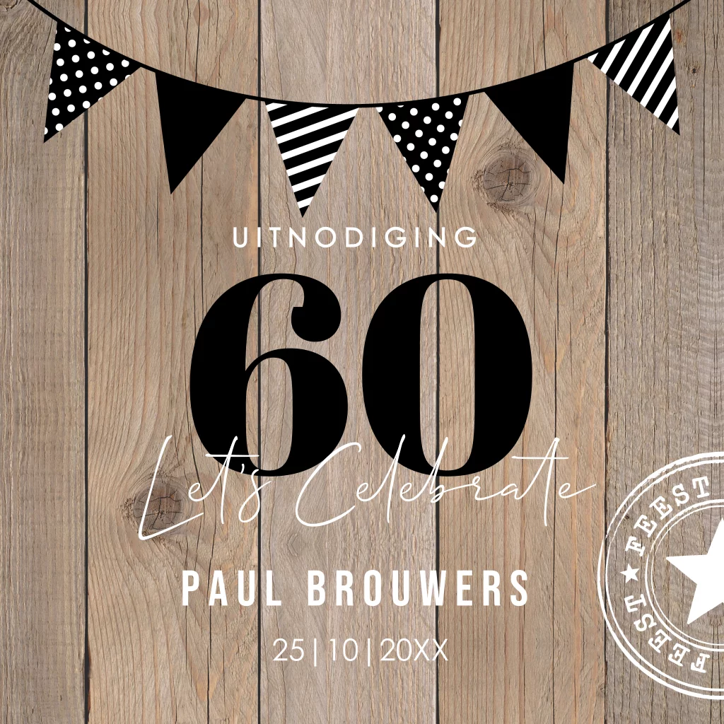 Verjaardag uitnodiging 60 jaar met houtlook en slinger zwart wit. Pas de leeftijd naar wens aan!
