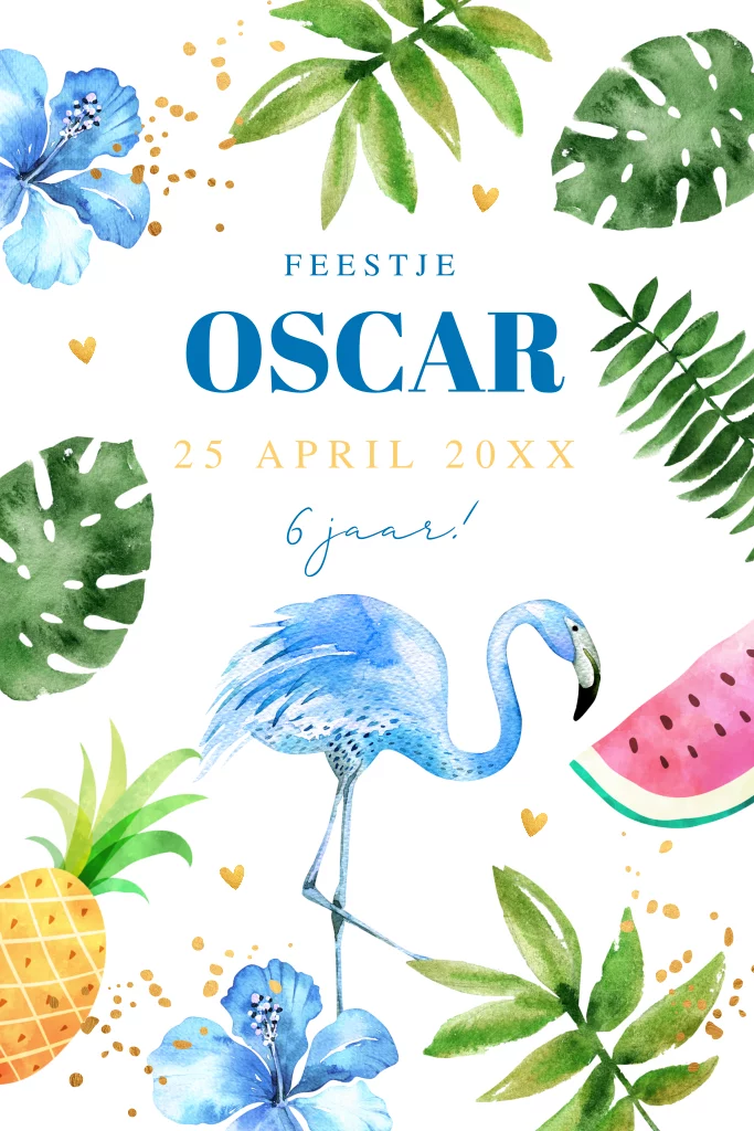Uitnodiging kinderfeestje voor een jongen met flamingo blauw en tropisch bladeren.