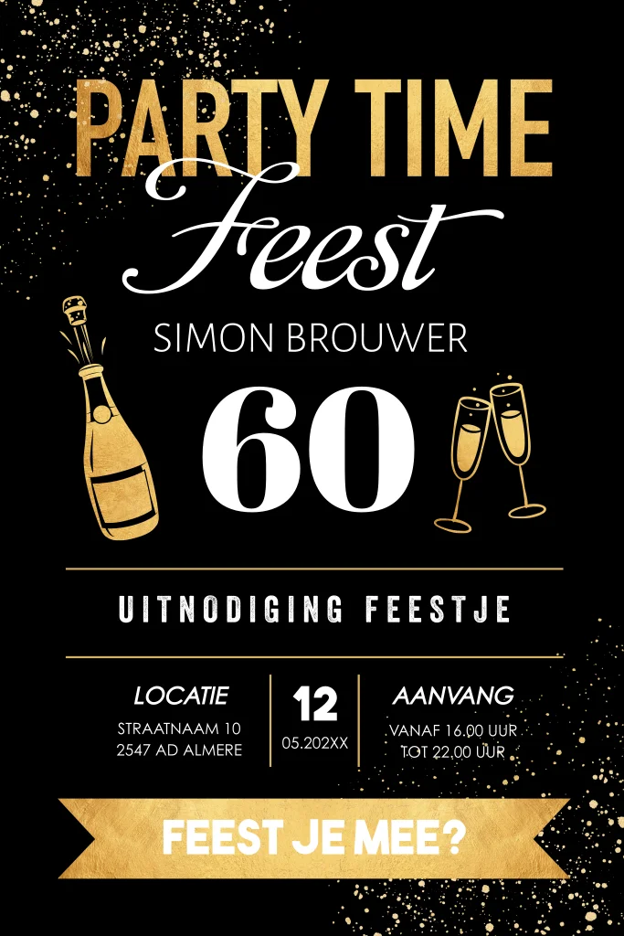 Uitnodiging verjaardag 60 jaar zwart met goudlook (geen folie) tekst, champagne en spetters.