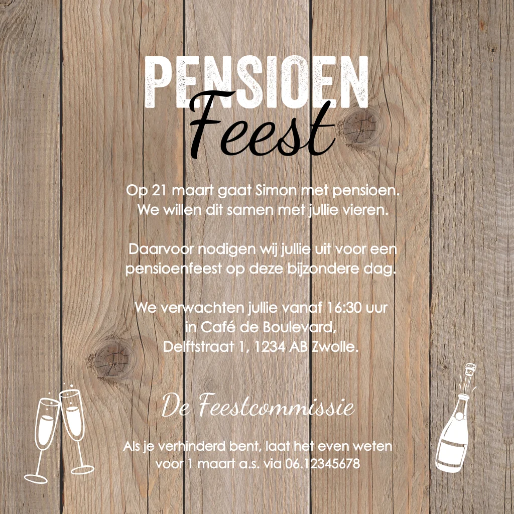 Pensioen uitnodiging kaart feest houtlook bruin slinger man