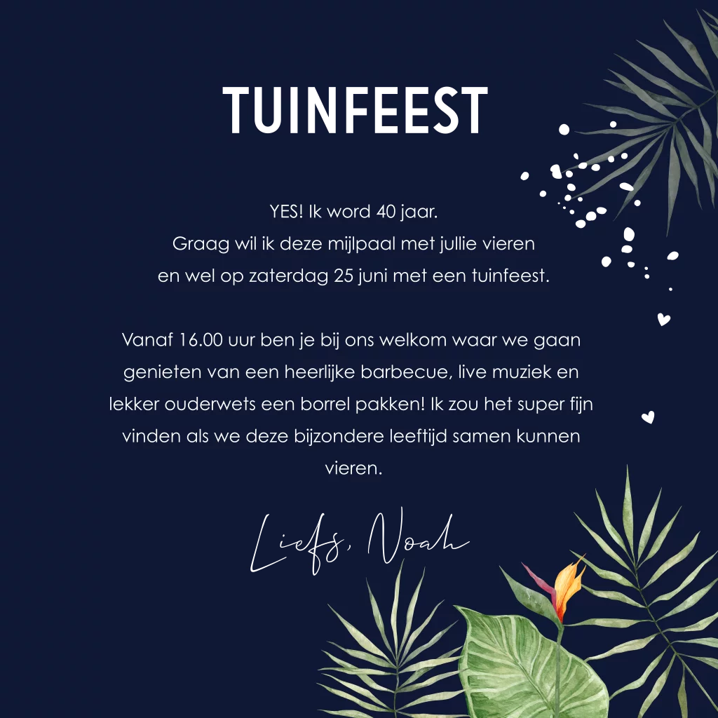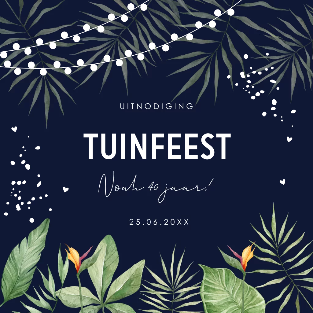 Uitnodiging tuinfeest verjaardag met tropische groene bladeren, slinger van lampjes en goudfolie.