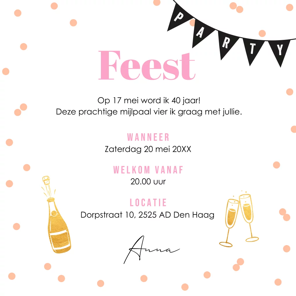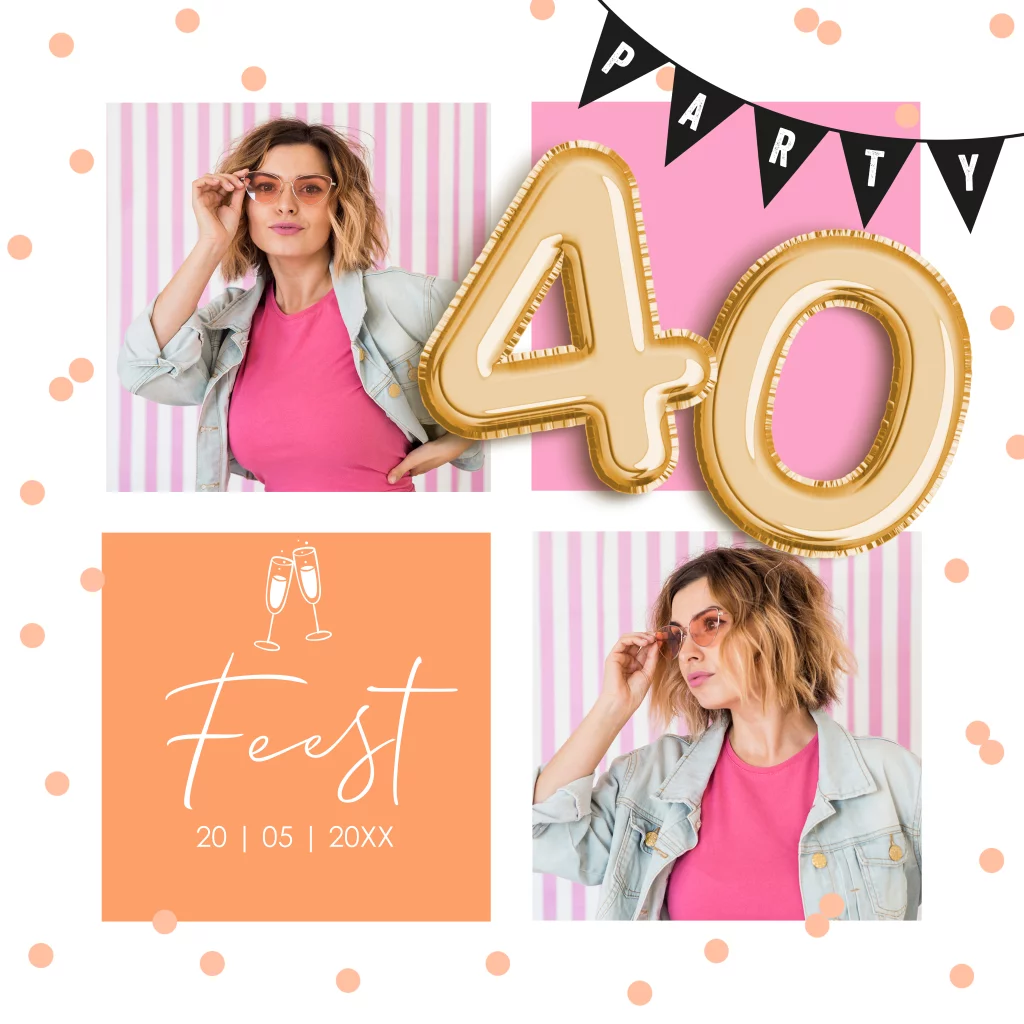 Uitnodiging verjaardag 40 jaar met foto's, slinger en roze confetti.