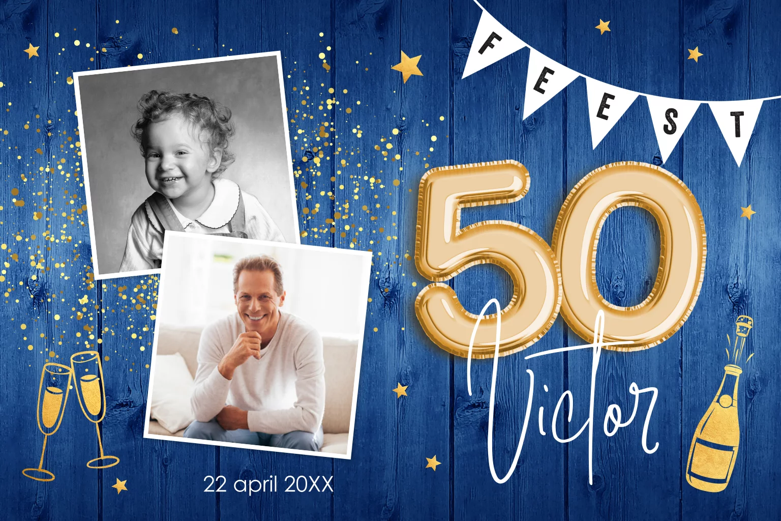 Uitnodiging verjaardag 50 jaar blauw met foto's, slinger, ballonnen en goudlook champagne. Geen folie!