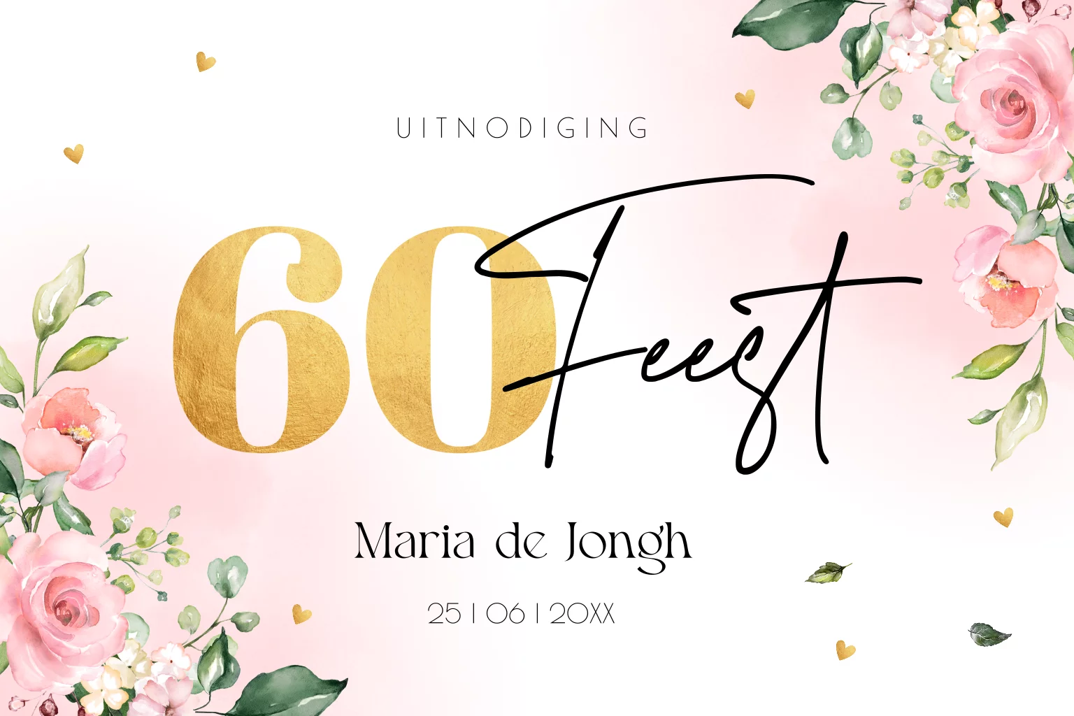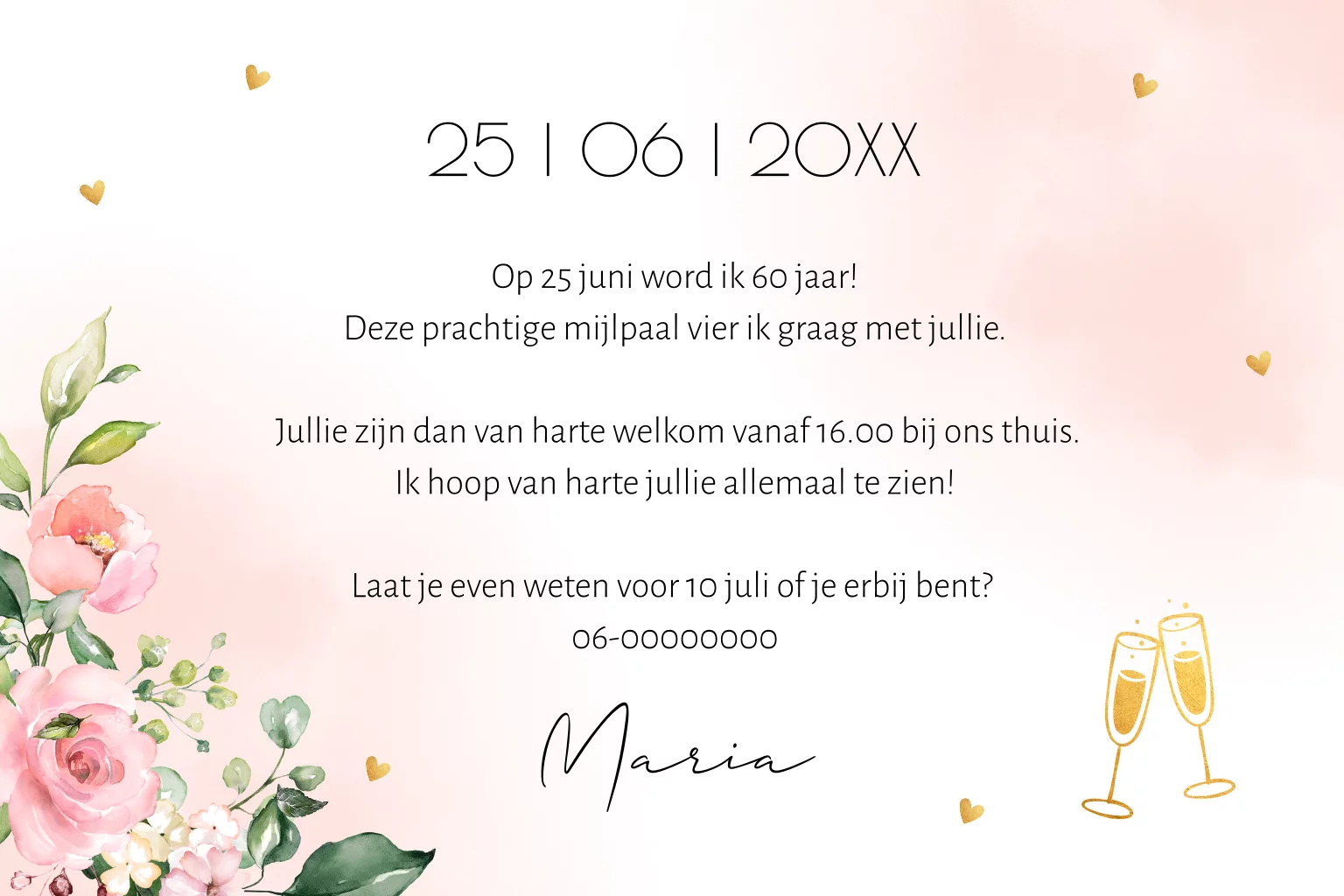Uitnodiging verjaardag 60 jaar voor een vrouw met roze bloemen en goudlook. Geen folie!