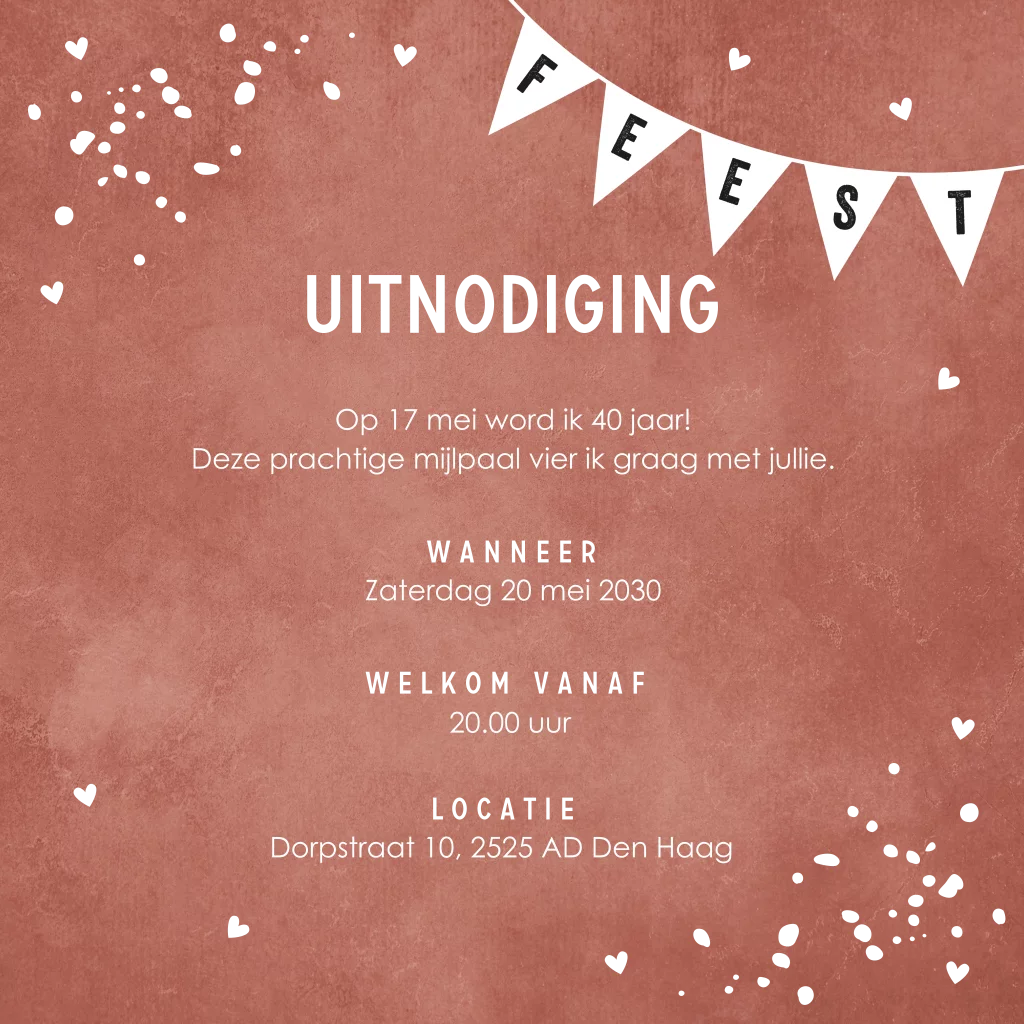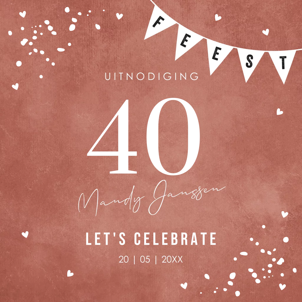 Uitnodiging verjaardag vrouw 40 jaar terracotta met confetti en goudfolie.