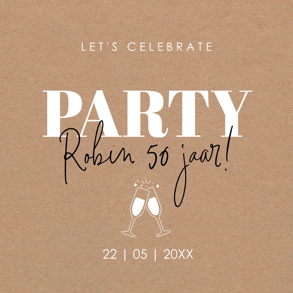 Uitnodiging verjaardag 50 jaar met kraftprint, proost champagneglazen en moderne typografie.