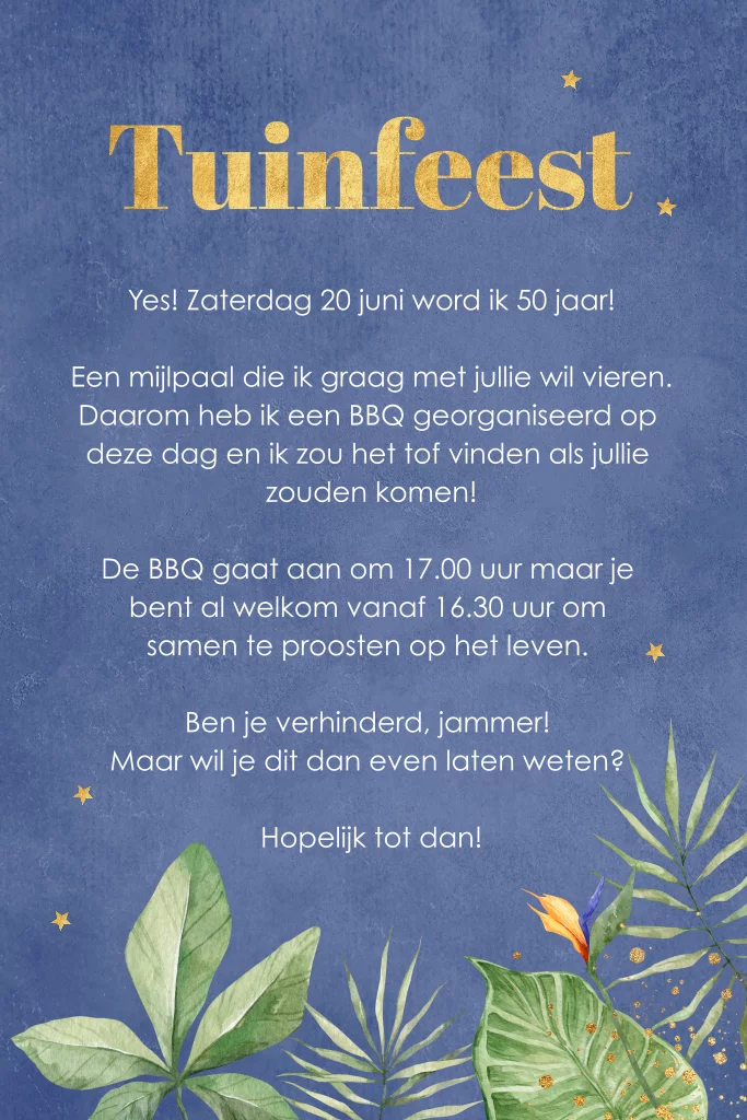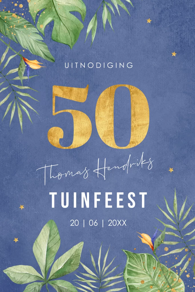 Uitnodiging tuinfeest verjaardag blauw met tropische bladeren en 50 jaar in goudlook. Meer goudlook leeftijden kan je vinden in de beeldbank bij "getallen".