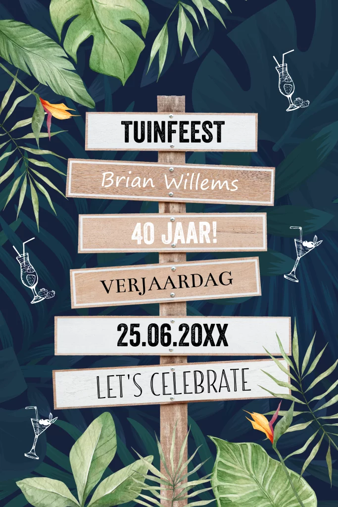 Uitnodiging tuinfeest met houten wegwijzer, lampjes en tropische bladeren.