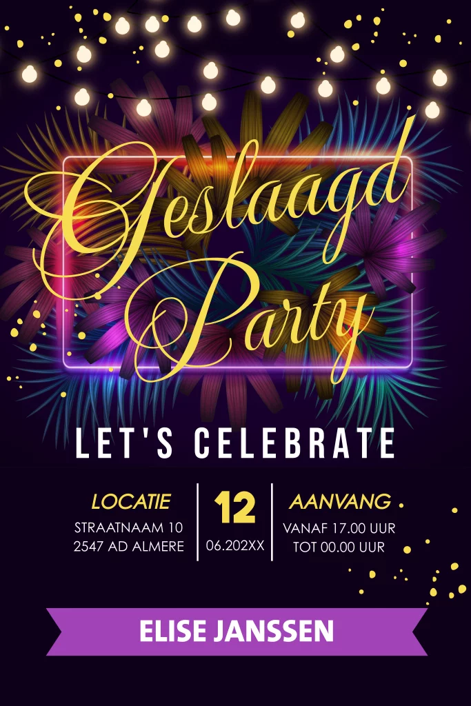 Utnodiging geslaagd party tuinfeest neon met lampjes, tropische bladeren en goudfolie.