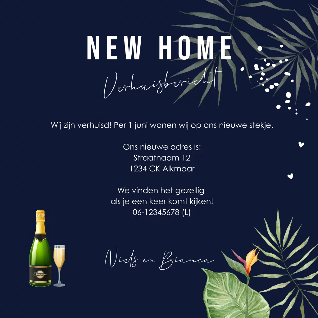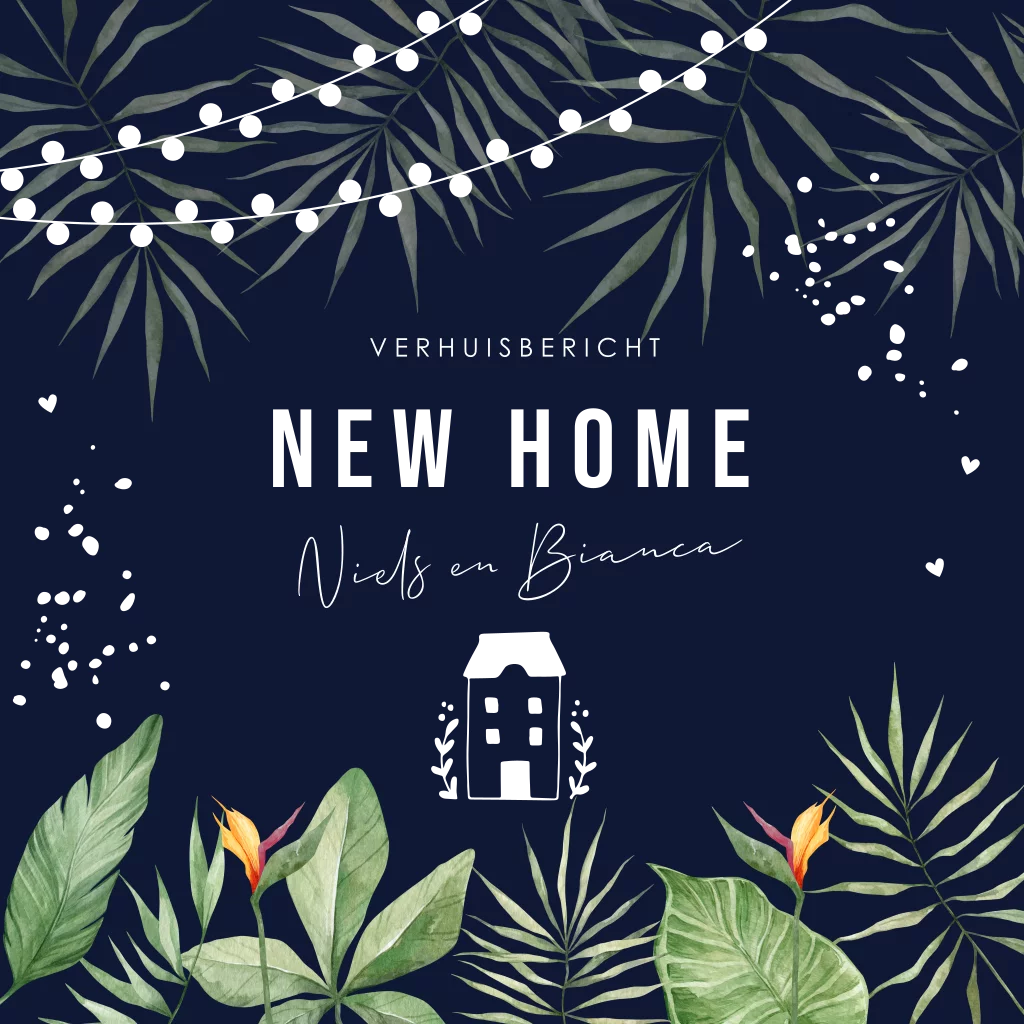 Verhuiskaart met tropische bladeren, slinger en goudfolie. In de binnenkant is ruimte voor foto 's.