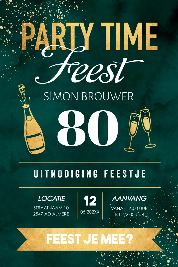 Uitnodiging verjaardag 80 jaar groen met goudlook (geen folie) tekst, champagne en spetters.
