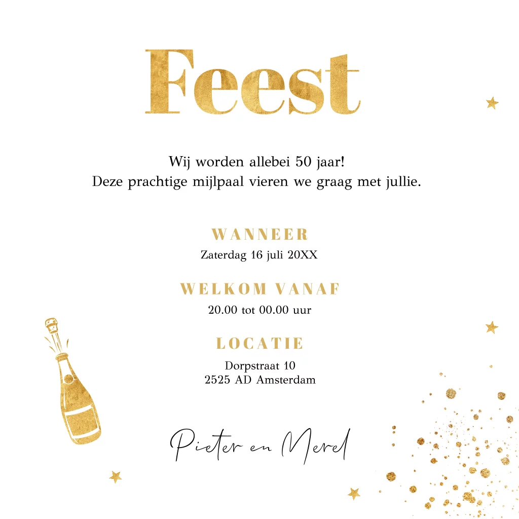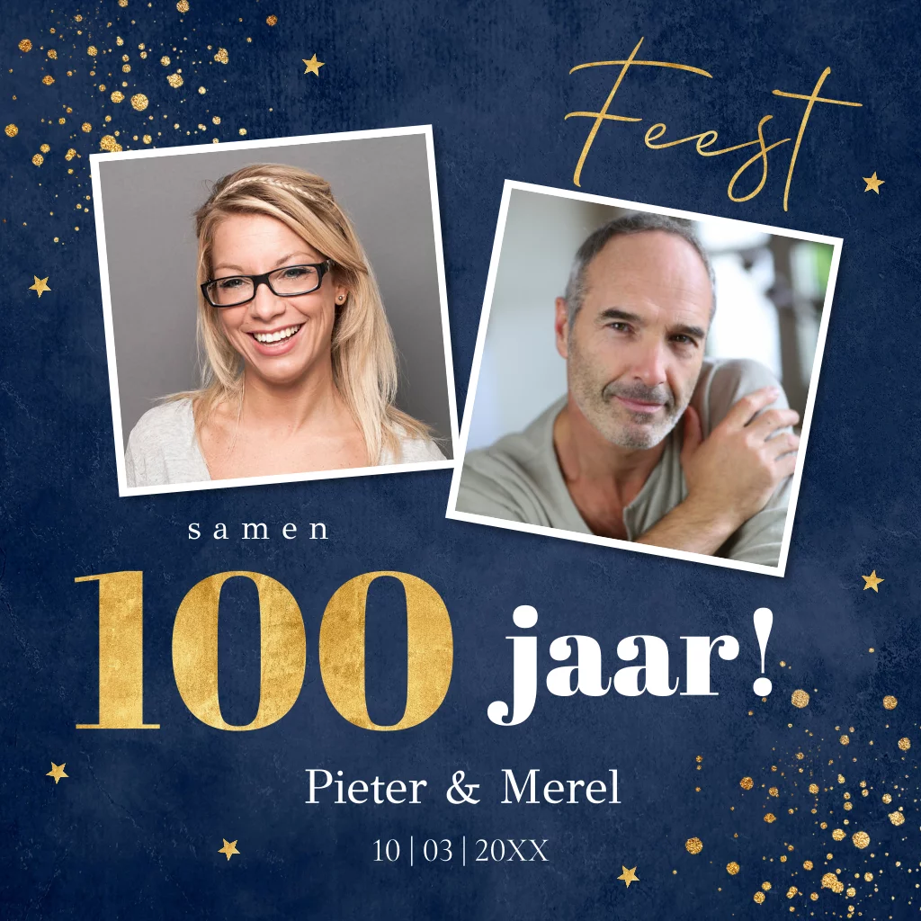 Uitnodiging verjaardag samen 100 jaar blauw met eigen foto' s en goudlook. Geen folie!