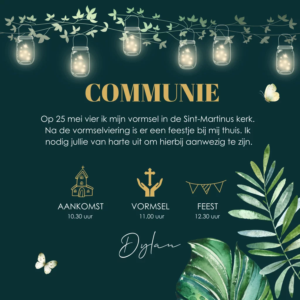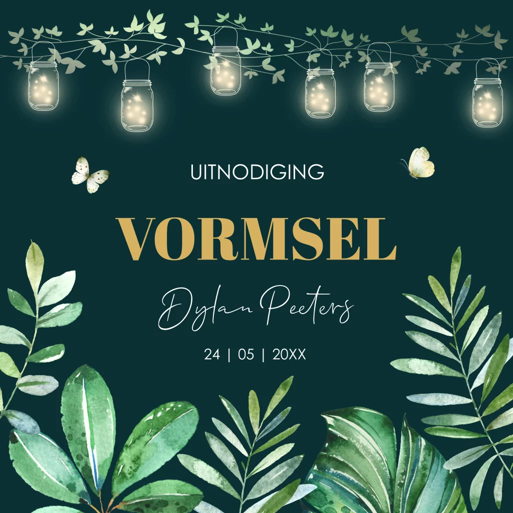 Vormsel uitnodiging voor een jongen groen met botanisch bladeren, vlinders en lampjes.