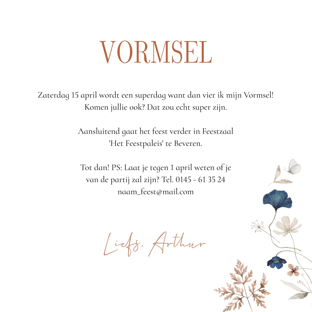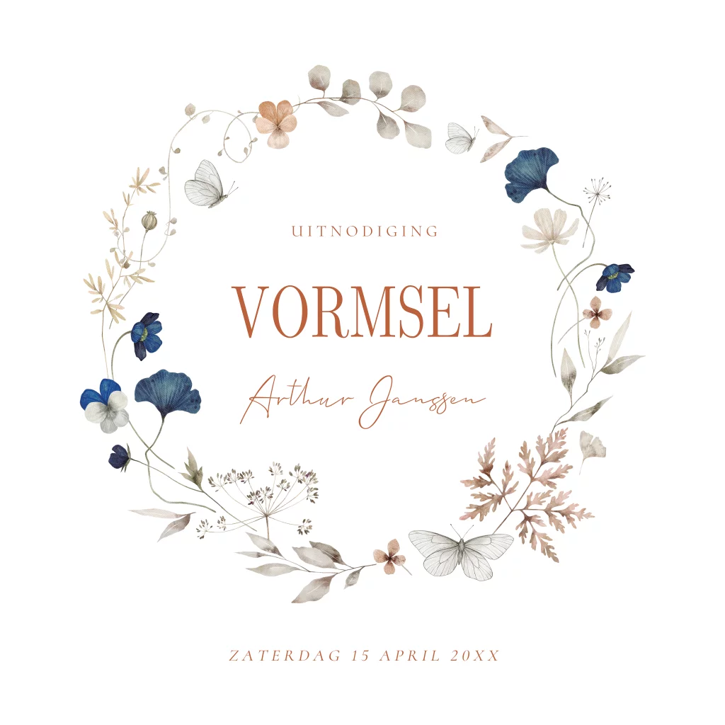 Vormsel uitnodiging voor een jongen wit met bloemenkrans blauw beige en bladeren.