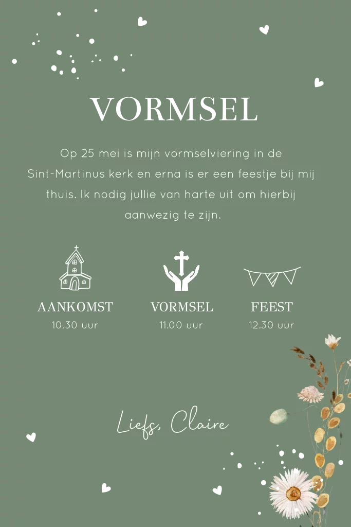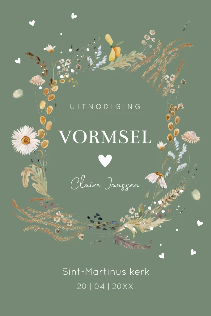 Vormsel uitnodiging voor een meisje groen met bloemenkrans en goudfolie.