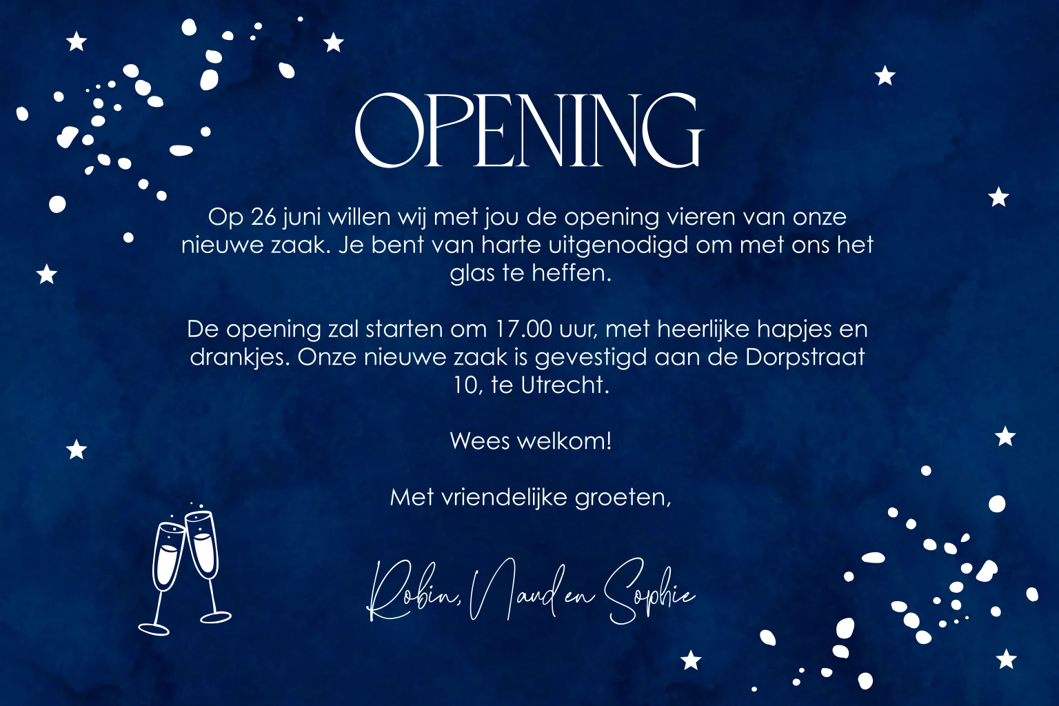 Zakelijke uitnodiging voor de opening van je nieuwe zaak of om de heropening van een verbouwing te vieren. Deze uitnodiging ziet er feestelijk uit blauw met luxe goudfolie.