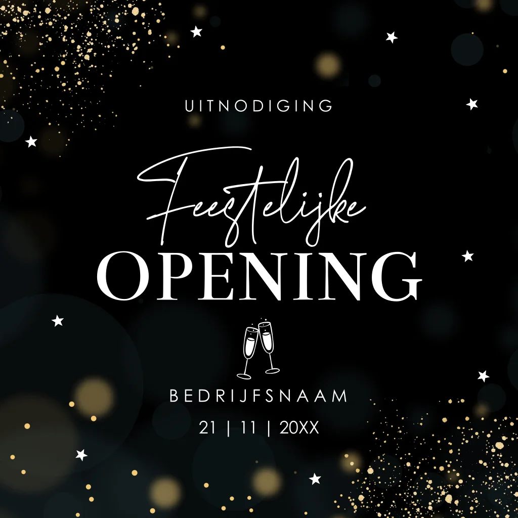 Zakelijke uitnodiging voor de opening van je nieuwe zaak of om de heropening van een verbouwing te vieren. Deze uitnodiging ziet er feestelijk uit zwart met spetters en luxe goudfolie.