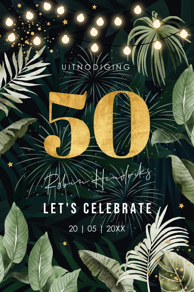 Uitnodiging verjaardag 50 jaar groen tropisch bladeren goudlook