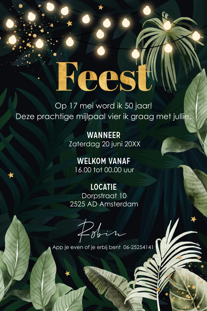 Uitnodiging tuinfeest verjaardag 50 jaar met groene tropische bladeren en goudlook. In de binnenkant is ruimte voor foto's.