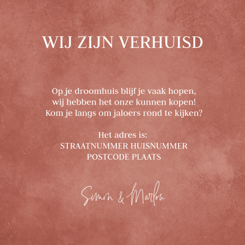 Sta je op het punt om te verhuizen of ben je net verhuisd? Dan is het tijd om verhuiskaarten te gaan versturen! Ga gelijk aan de slag met het maken van een mooie verhuiskaart en voeg eigen tekst en/of een mooie foto toe. Ben je helemaal klaar met je ontwerp bestel dan een proefdruk voor €1. Inspiratie nodig voor tekst op de verhuiskaarten? Zie: Tekstvoorbeelden
