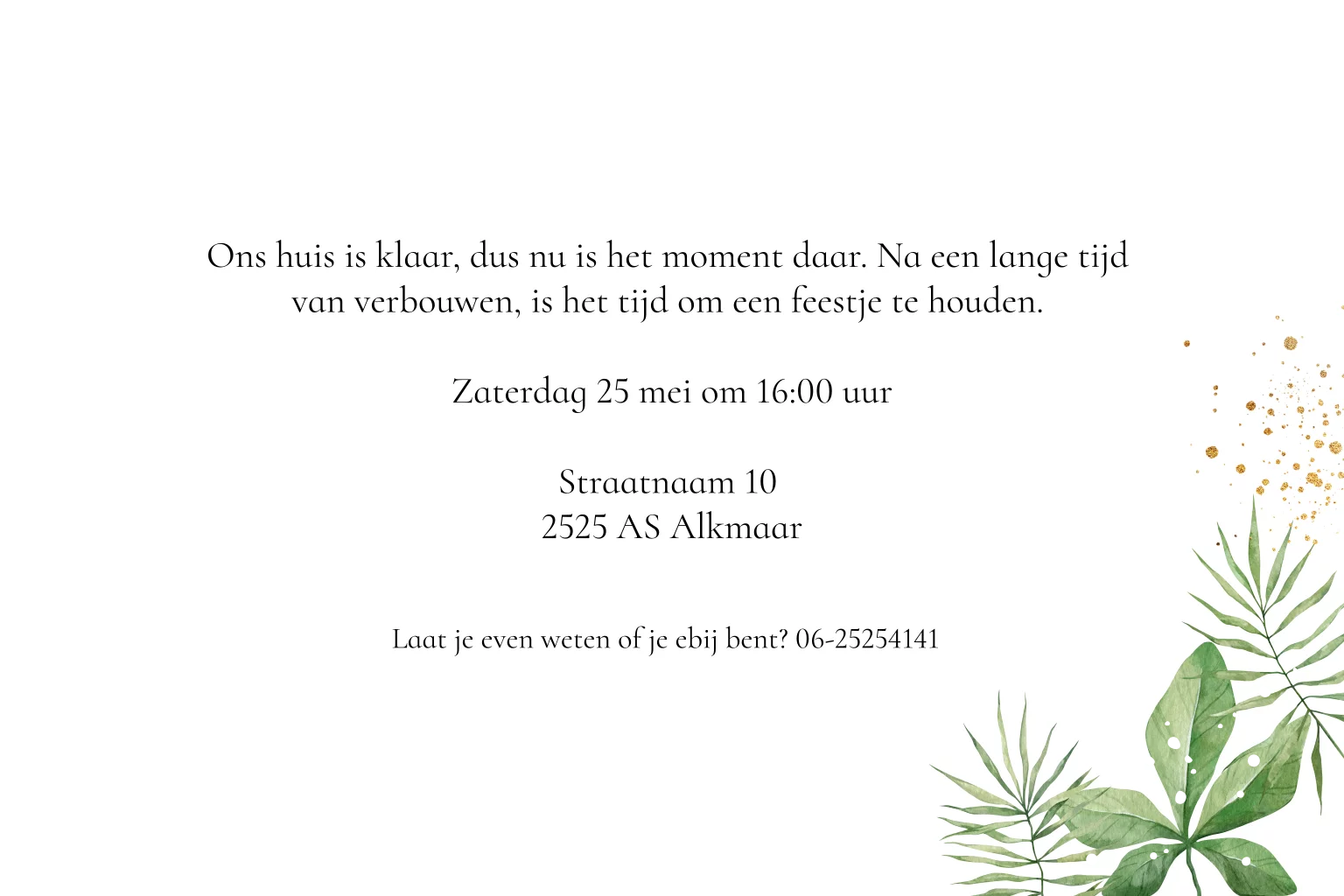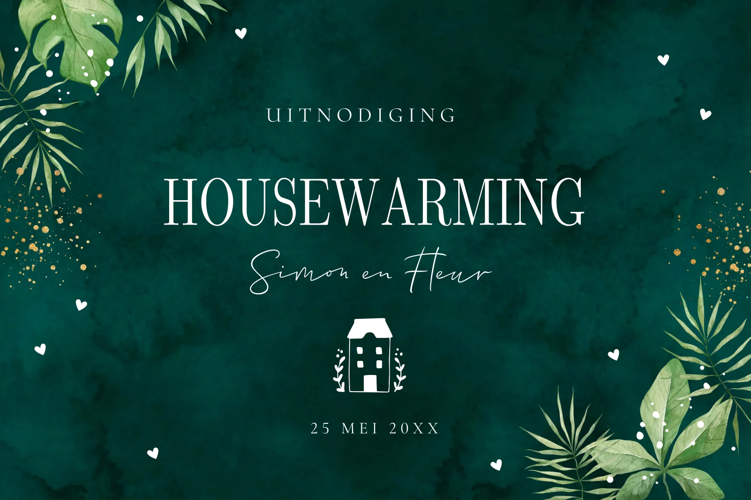 Housewarming uitnodiging groen met tropische bladeren, huisje en goudfolie.