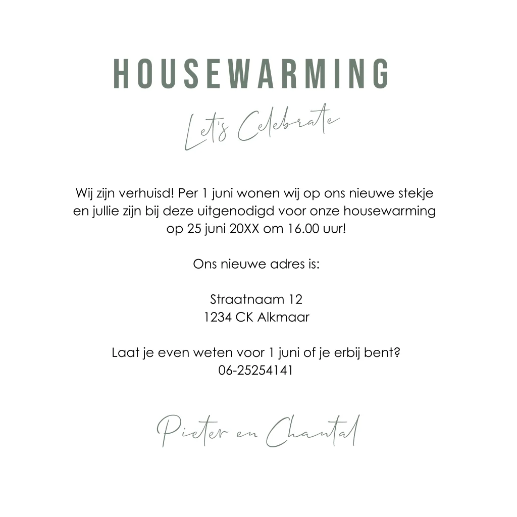 Housewarming party uitnodiging groen met huisjes en slinger "New Home".