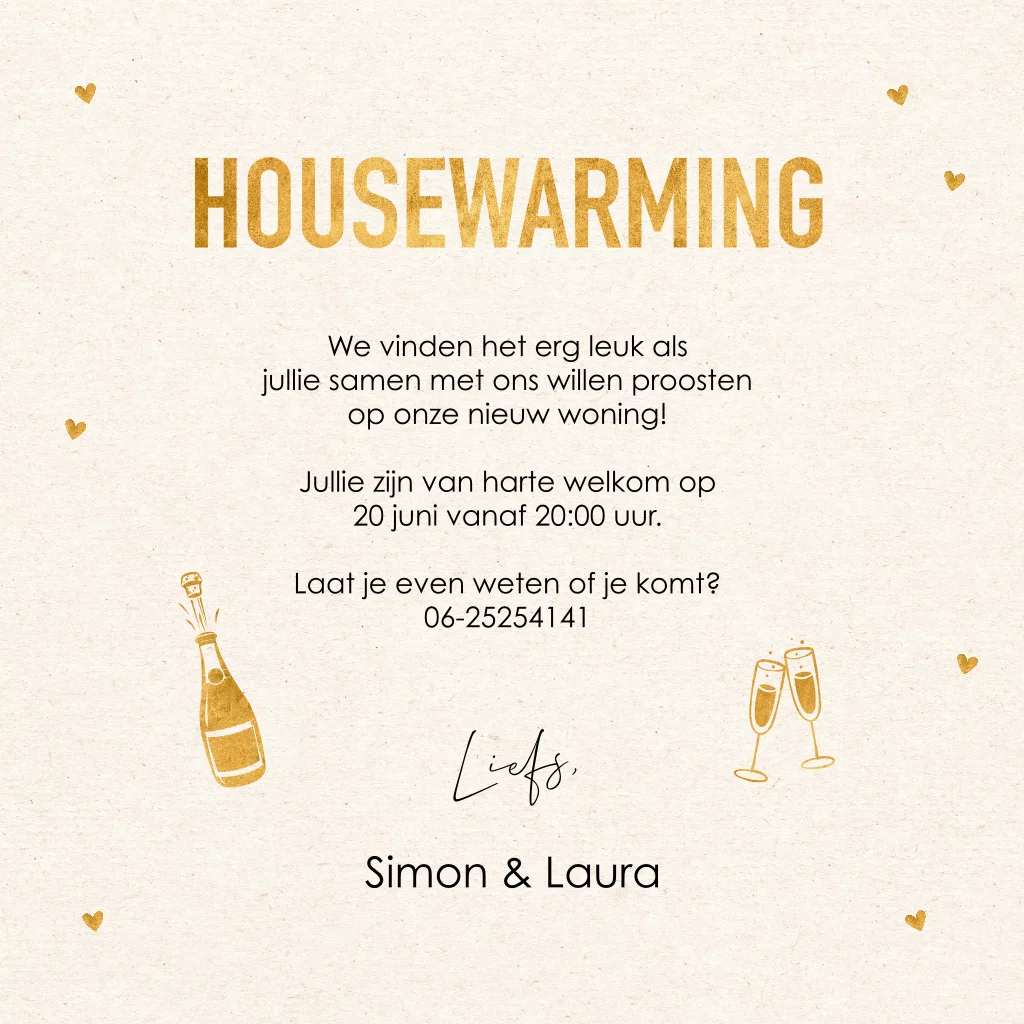 Housewarming uitnodiging wit met foto 's, hartjes en goud look tekst (geen folie).