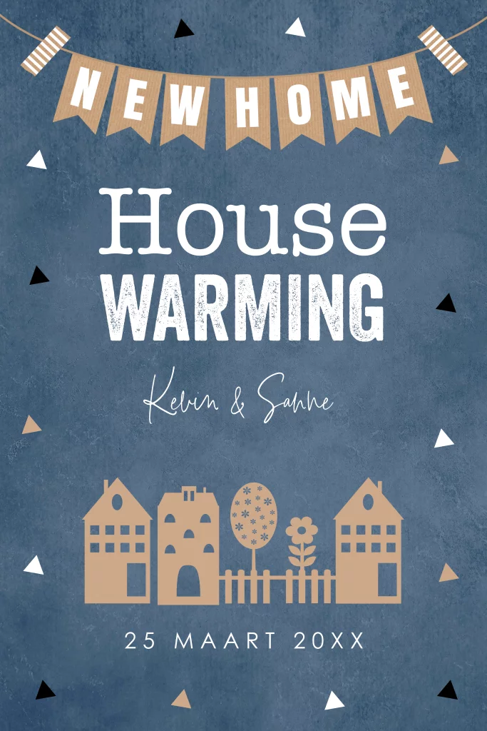 Housewarming uitnodiging blauw driehoekjes huisjes slinger