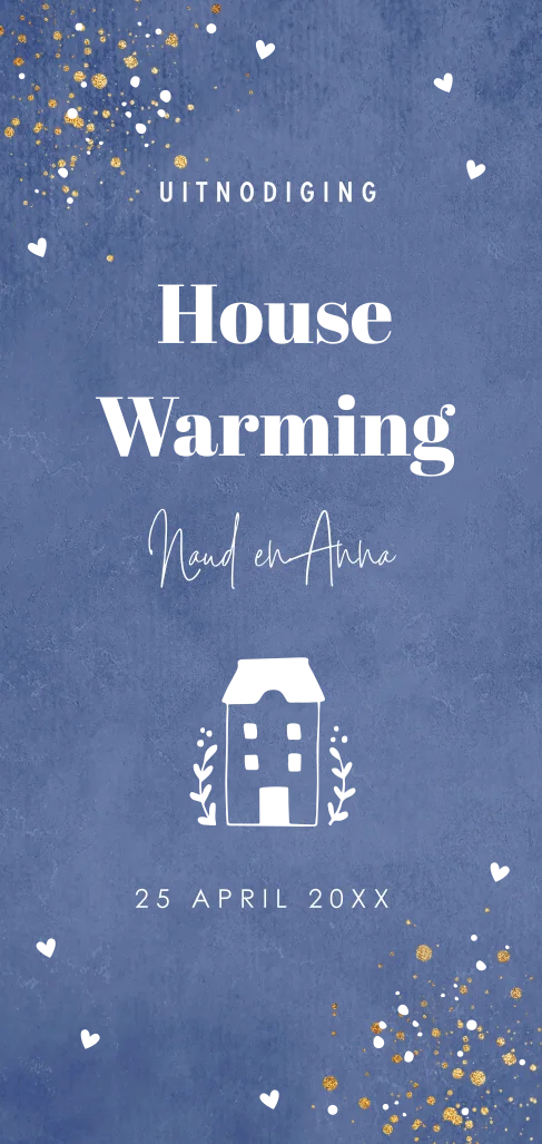 Housewarming uitnodiging blauw huisje spetters goudfolie