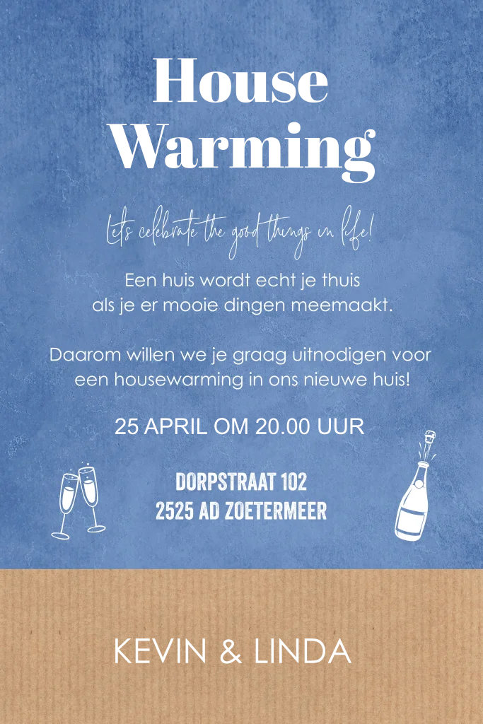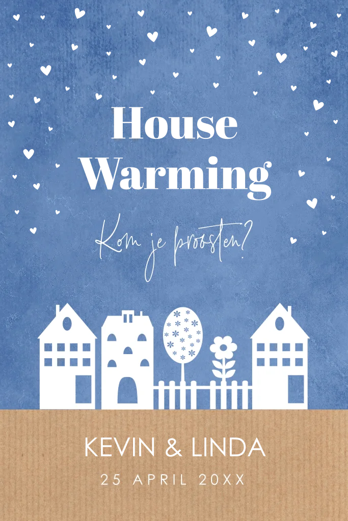 Housewarming uitnodiging blauw met hartjes, huisjes en goudfolie.