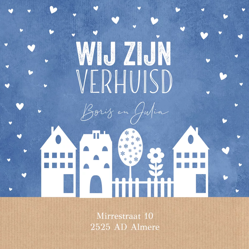 Verhuiskaart blauw met witte huisjes en hartjes.