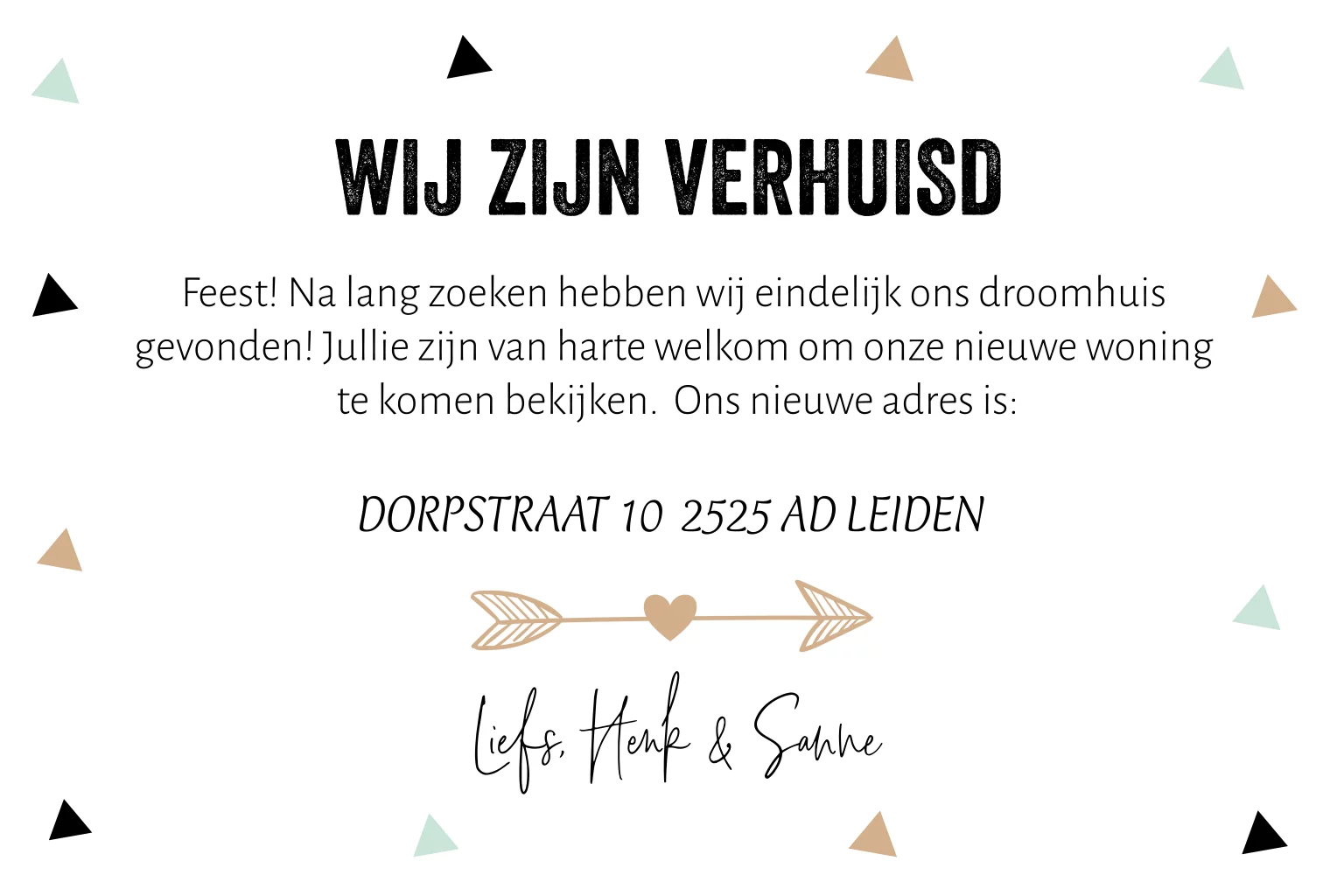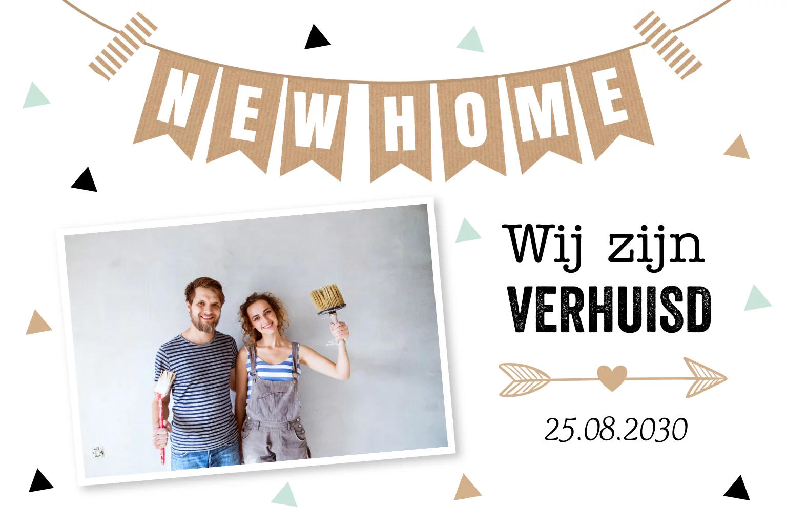 Leuke trendy verhuiskaart met foto, slinger "new home" en driehoekjes.