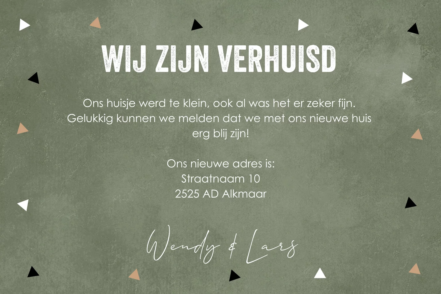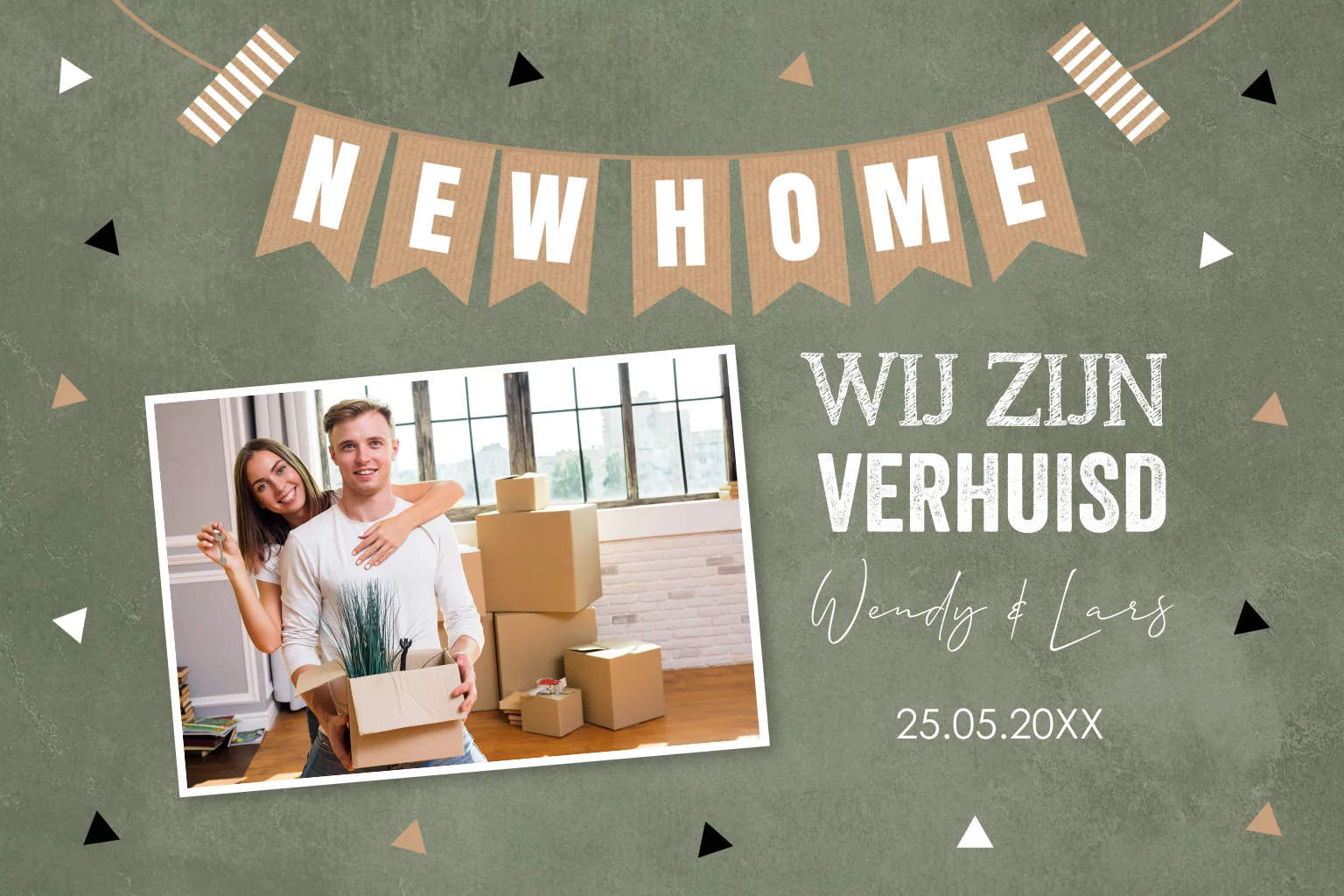 Trendy verhuiskaart groen met slinger met New Home, foto en driehoekjes.