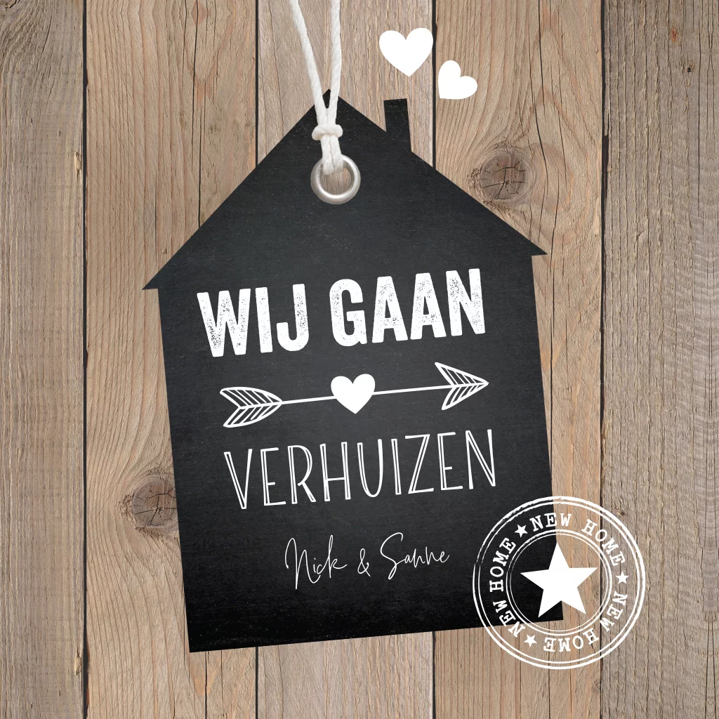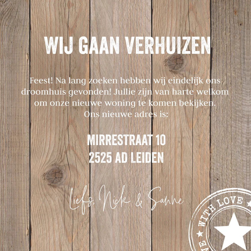 Stoere verhuiskaart met houtlook en zwart huisje.