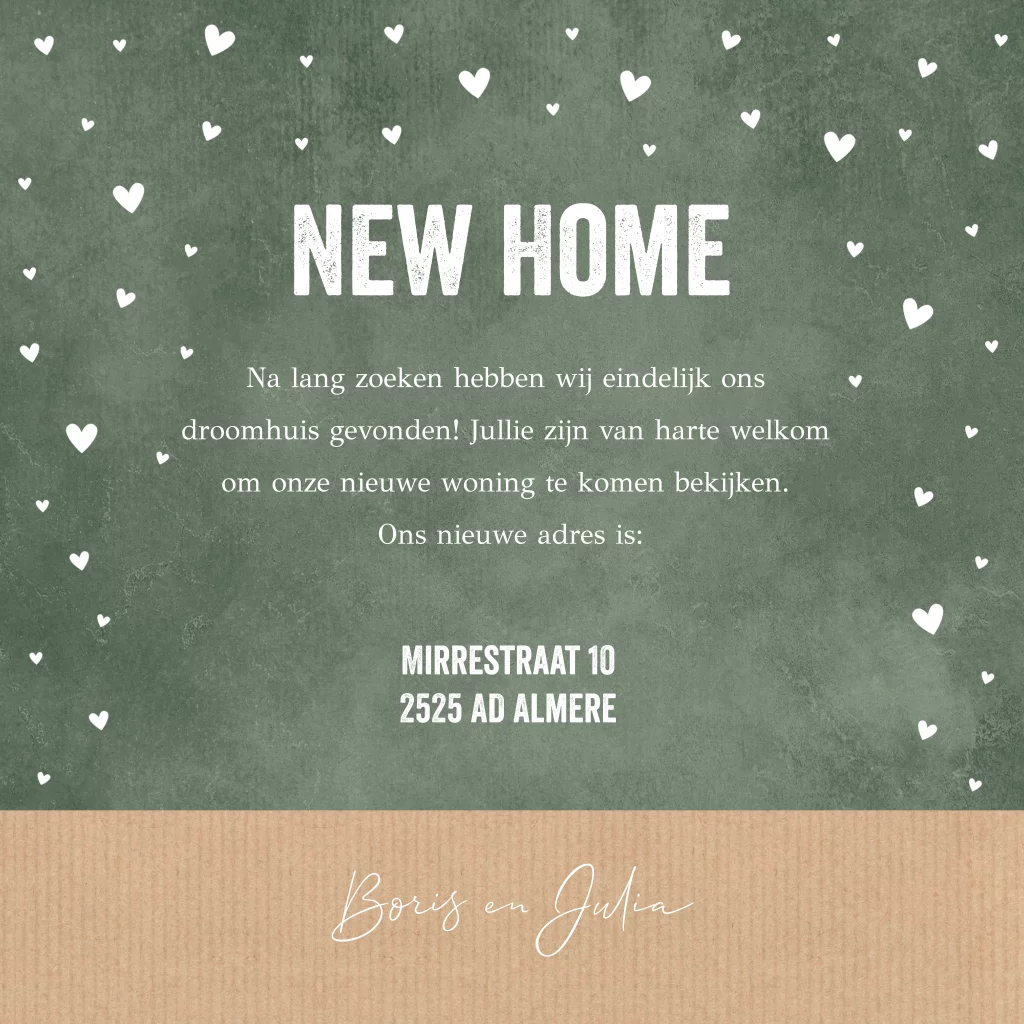Verhuiskaart groen met witte huisjes, hartjes en kraft look.
