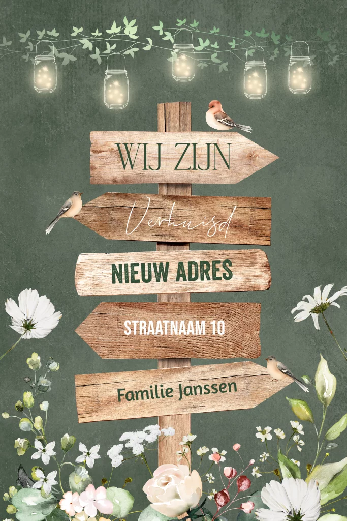 Verhuiskaart groen met wegwijzer hout, lampjes en bloemen.