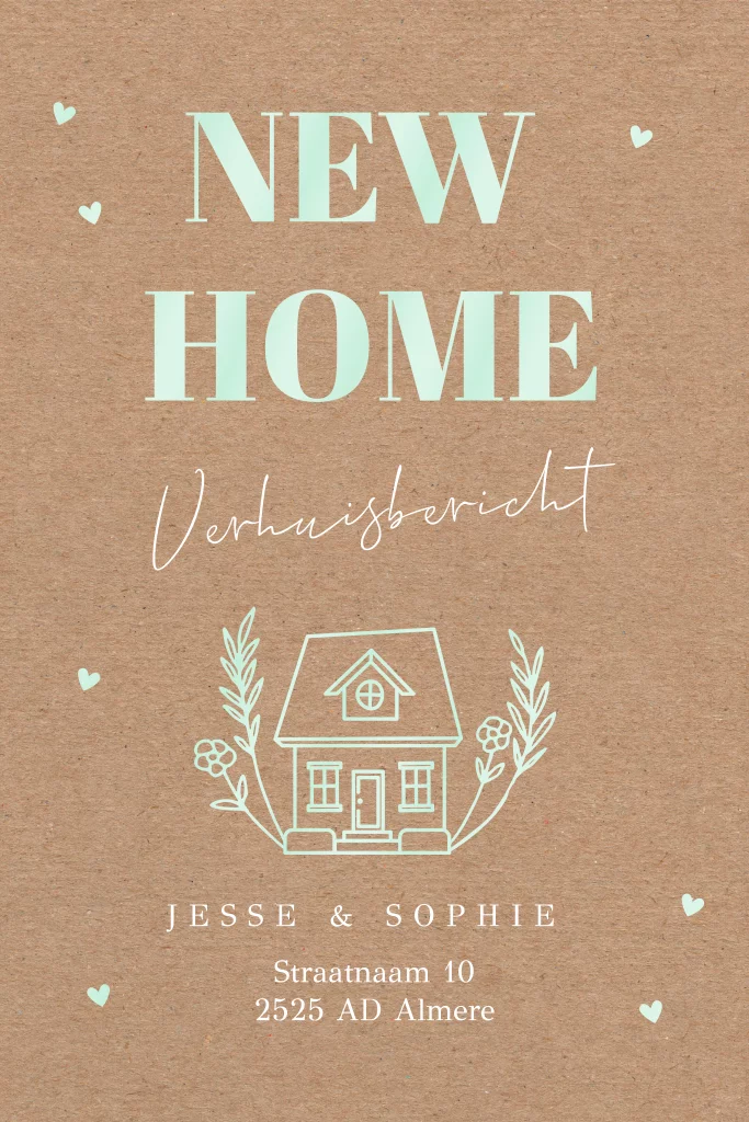 Verhuiskaart kraft look met huisje en hoogglans mintgroen. Pas de kleur van de hoogglans naar wens aan.