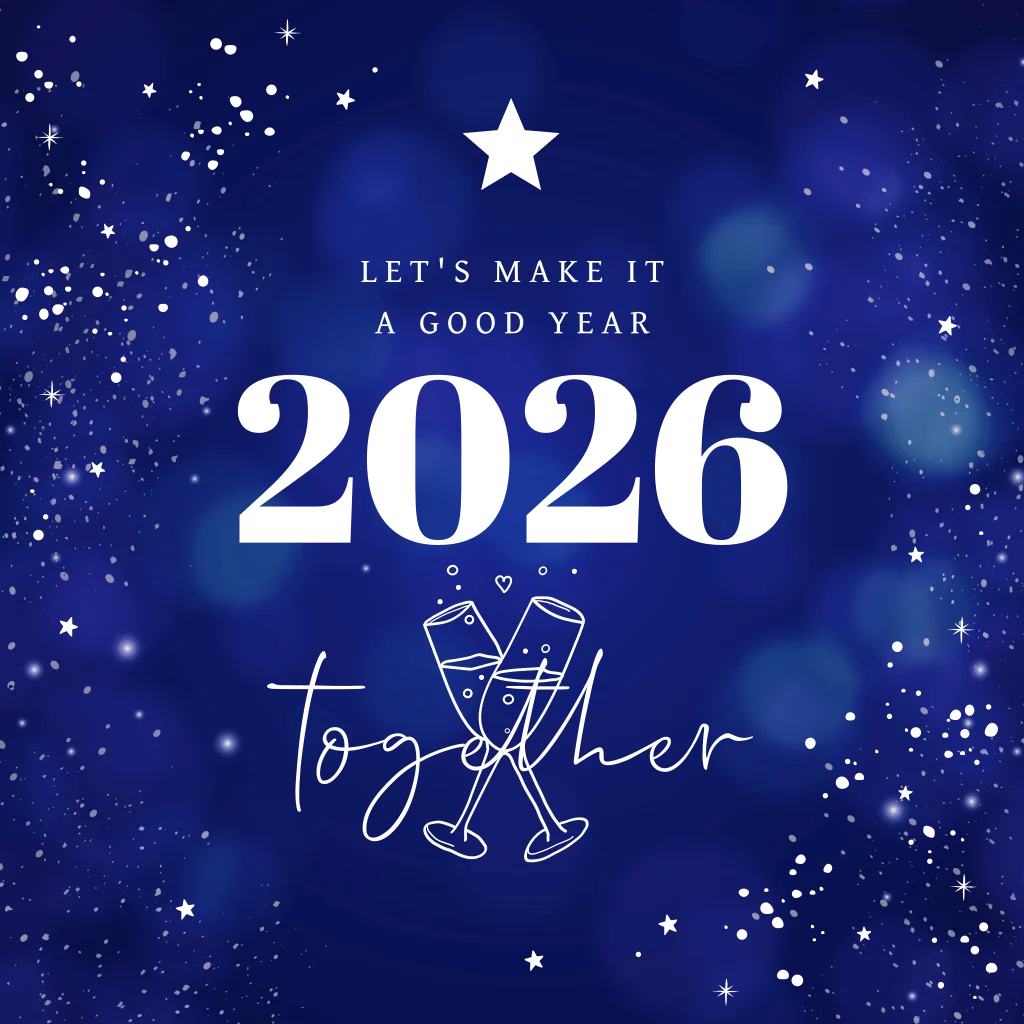 Zakelijke kerstkaart blauw 2026 holografische folie champagne glazen