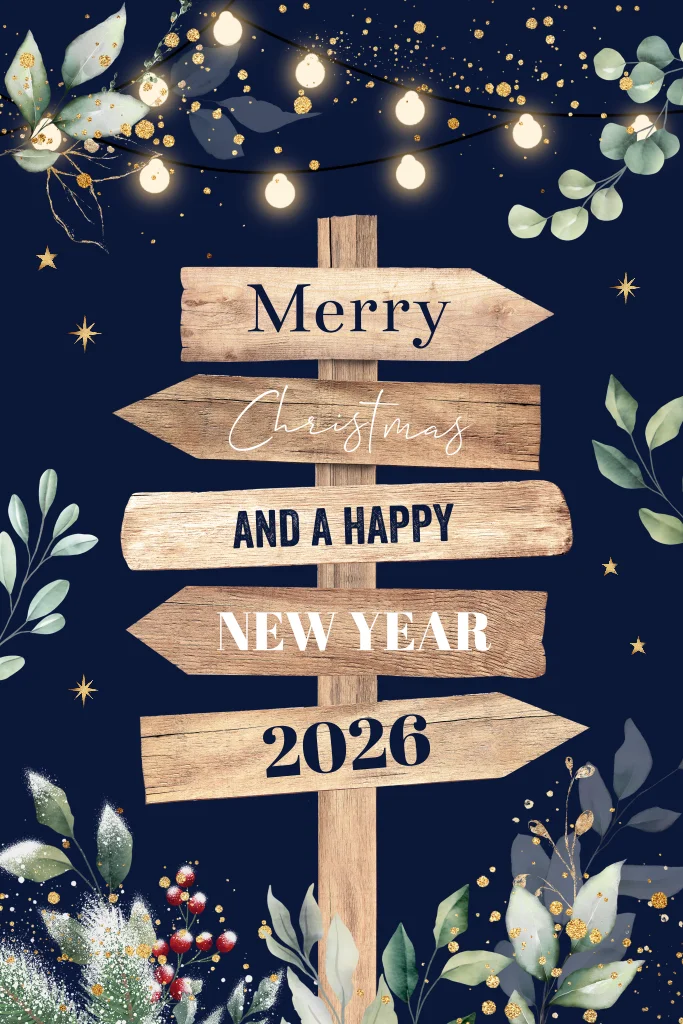 Kerstkaart houten wegwijzer botanisch bladeren blauw groen 2026