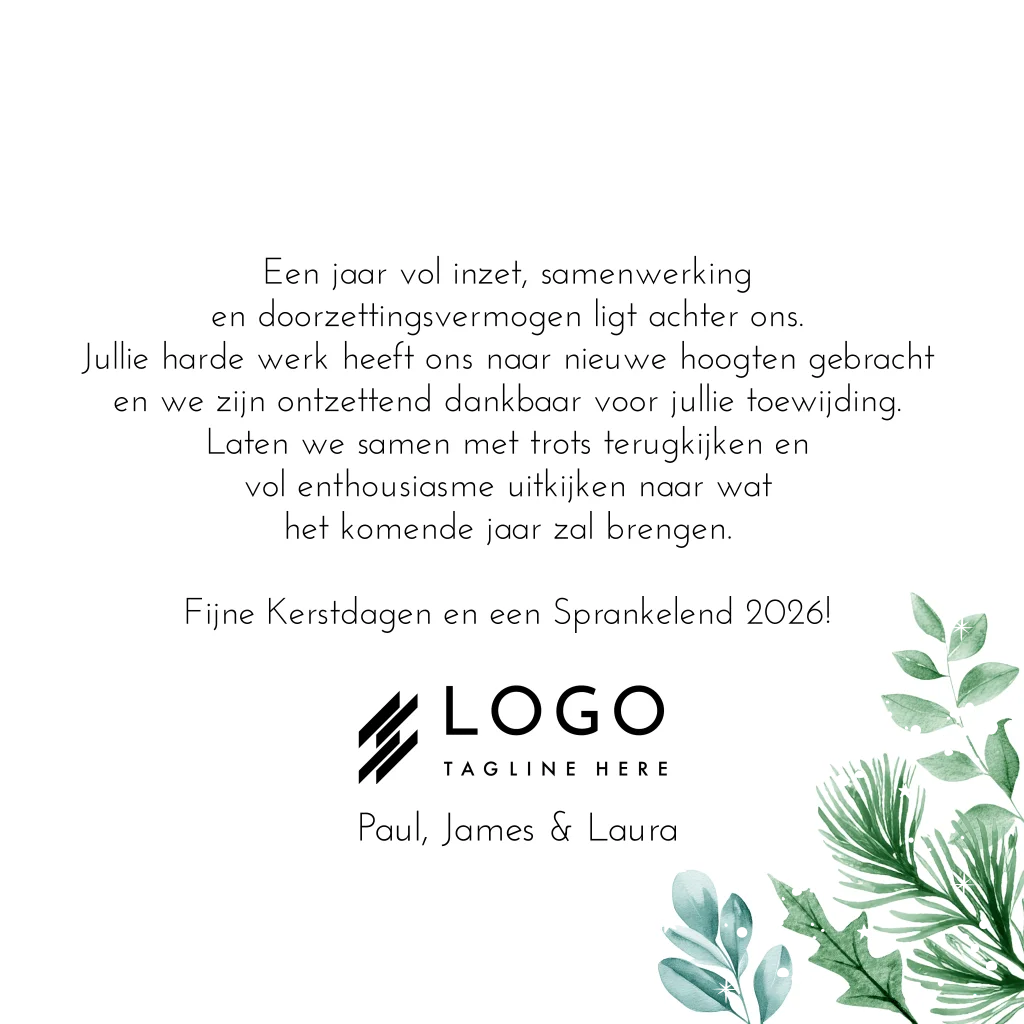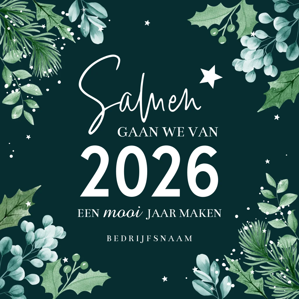 Sfeervolle zakelijke kerstkaart medewerkers botanisch groen met kersttakjes en goudfolie.
