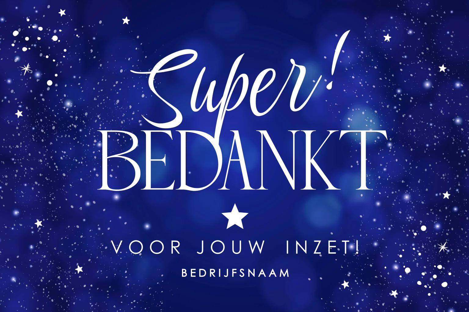 Een zakelijke kerstkaart blauw met spetters en goudfolie om uw medewerkers te bedanken voor hun inzet het afgelopen jaar. Super bedankt voor jouw inzet!