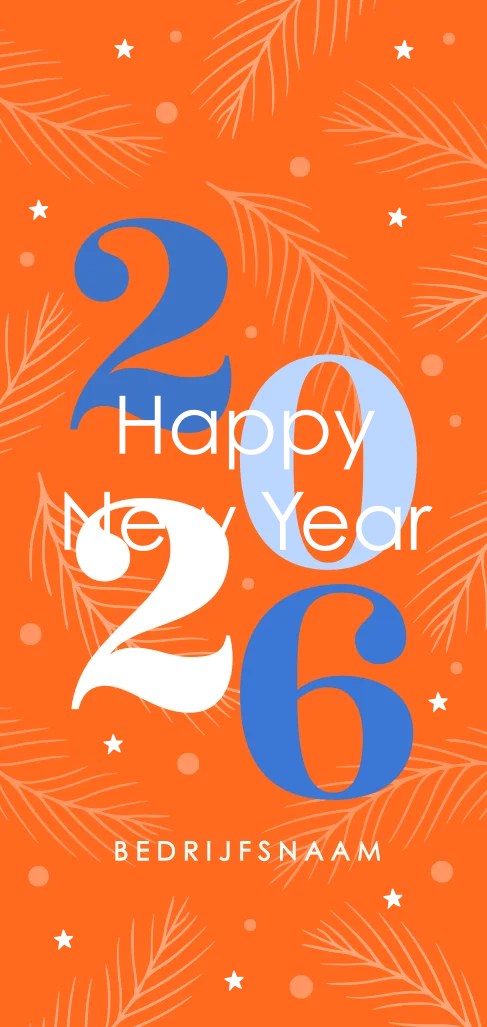 Zakelijke kerstkaart oranje blauw met kersttakjes, jaartal 2026 en goudfolie. Op de achterkant is ruimte voor een logo of foto.