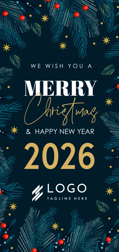 Zakelijke kerstkaart blauw langwerpig met kersttakjes en jaartal 2026!
