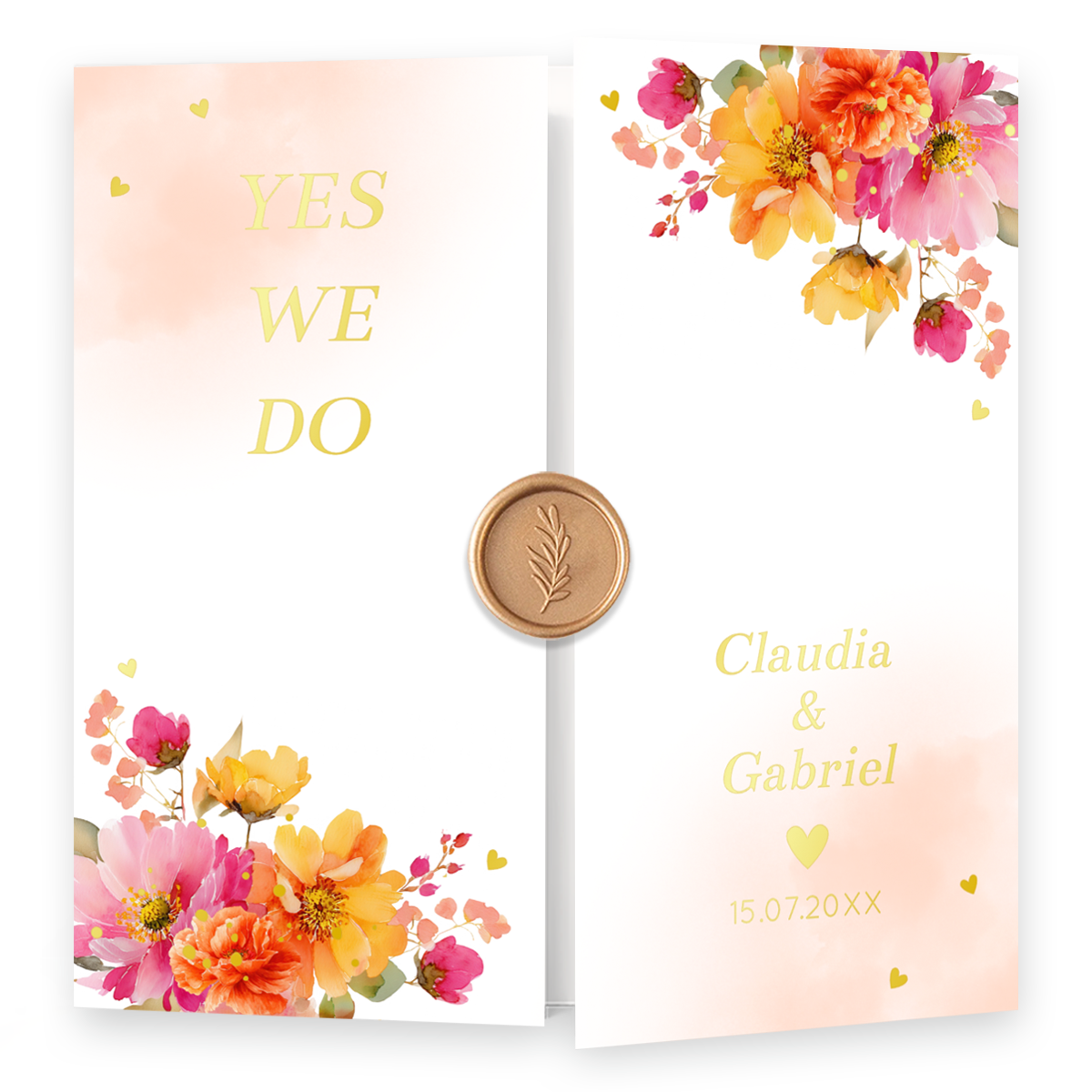 Luikvouw trouwkaart vierkant met gekleurde gekleurde bloemen roze oranje en luxe goudfolie. Je vouwt de voorste twee 'deurtjes' naar binnen toe. Voeg zelf in de editor informatie toe over jullie trouwdag. LET OP: Plaats je tekst of afbeeldingen niet te dicht op de rand, omdat de tekst er tijdens het drukken vanaf kan vallen. De veilige afstand tot de rand is aangegeven met arceringen.