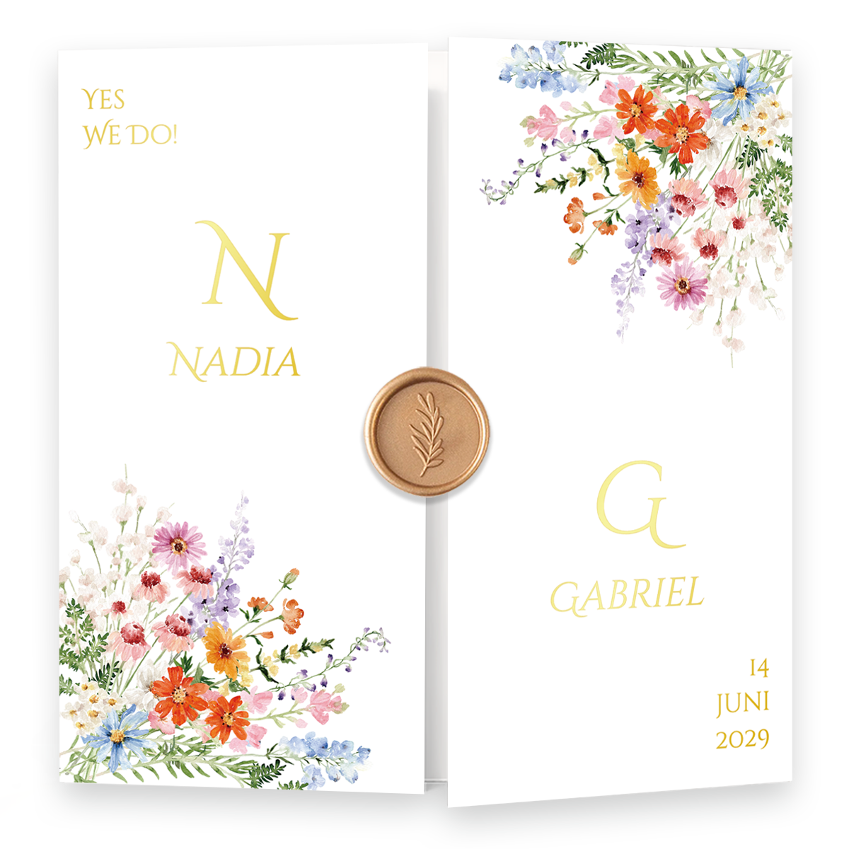 Theatervouw trouwkaart vierkant met zomerse gekleurde bloemen en luxe goudfolie. Je vouwt de voorste twee 'deurtjes' naar binnen toe. Voeg zelf in de editor informatie toe over jullie trouwdag. LET OP: Plaats je tekst of afbeeldingen niet te dicht op de rand, omdat de tekst er tijdens het drukken vanaf kan vallen. De veilige afstand tot de rand is aangegeven met arceringen.