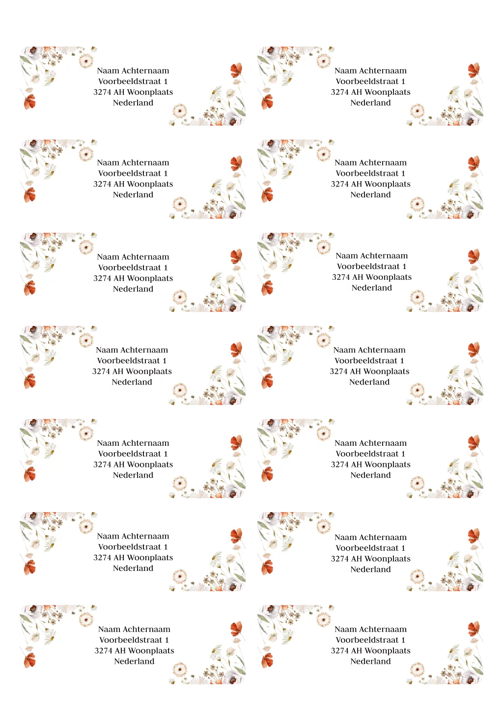Adresstickers met wilde bloemen rood wit. Naast dat je het design helemaal kan aanpassen, plaats je heel eenvoudig zelf alle adressen op de adresstickers. • 14 adresstickers per vel • formaat van 97x34 mm • ronde hoeken Maak het geboortekaartje helemaal af door de envelop dicht te plakken met een bijpassende sluitzegel!